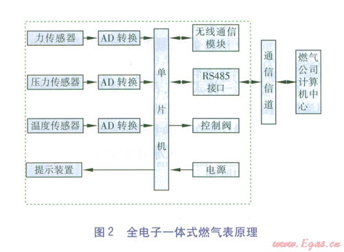壓力傳感器、溫度傳感器、力傳感器的模擬信號(hào)經(jīng)AD轉(zhuǎn)換后傳給單片機(jī),單片機(jī)加以處理后發(fā)送給提示裝置(液晶屏、發(fā)光管和蜂鳴器)以提示用戶,并可向控制閥發(fā)出指令以實(shí)現(xiàn)通斷功能。通過通信接口(RS485)將計(jì)量數(shù)據(jù)通過通信信道發(fā)送到燃?xì)夤镜挠?jì)算機(jī)中心,或通過無(wú)線通信模塊以無(wú)線傳輸?shù)姆绞桨l(fā)送到燃?xì)夤镜挠?jì)算機(jī)中心,并接受計(jì)算機(jī)中心發(fā)出的指令實(shí)現(xiàn)控制功能。全電子一體式燃?xì)獗碓硪妶D2。