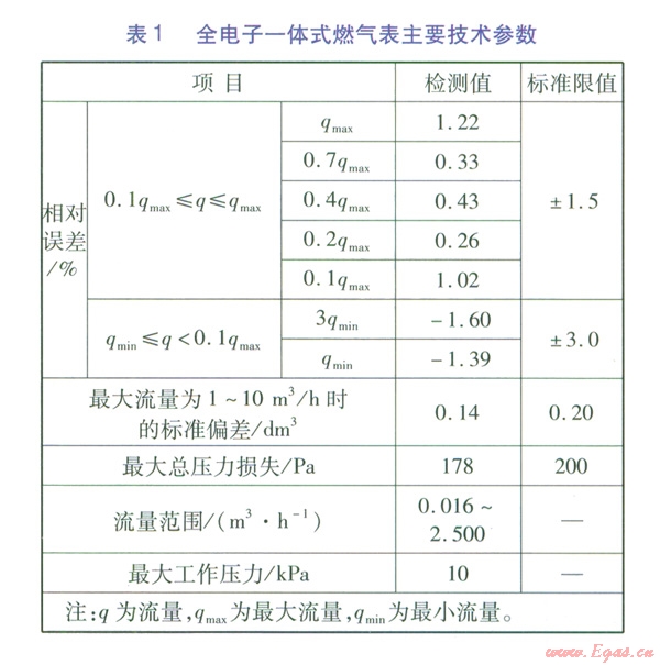 全電子一體式燃?xì)獗硗ㄟ^了無(wú)錫市計(jì)量測(cè)試中心對(duì)精確度、重復(fù)性、總壓力損失的檢測(cè),取得了校準(zhǔn)證書。因目前沒有相應(yīng)的標(biāo)準(zhǔn),只能參照膜式燃?xì)獗淼臉?biāo)準(zhǔn),其技術(shù)指標(biāo)均達(dá)到GB/T6968-2011《膜式燃?xì)獗怼?span lang="EN-US">1.5級(jí)表的要求,主要技術(shù)參數(shù)見表l。