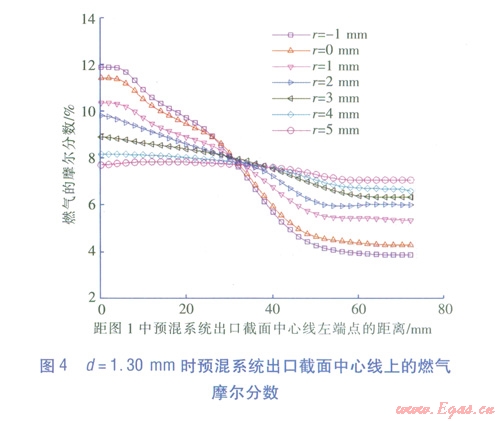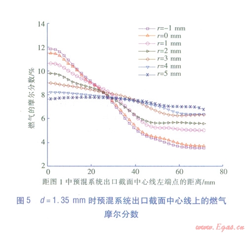 不同噴嘴直徑d 和噴嘴位置條件下,預(yù)混系統(tǒng)出口截面中心線上混合氣中燃氣的摩爾分數(shù)見圖4~6可知,當r=-1mm和r=0mm時,中心線上燃氣摩爾分數(shù)的不一致性非常明顯,摩爾分數(shù)波動范圍為4%~12%。R越大,中心線上的燃氣的摩爾分數(shù)一致性越好。當r=4mm和5mm時,中心線上燃氣的摩爾分數(shù)幾乎相同,這說明此條件下混合效果比較好。因此,為了實現(xiàn)燃氣和空氣的完全預(yù)混,取r>4mm。