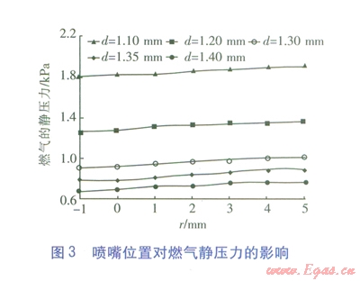 模擬的噴嘴位置對燃氣靜壓力的影響見圖3。由圖3可知,噴嘴的直徑越小,燃氣所需要的靜壓力越大。當噴嘴的直徑d<1.30mm時,燃氣的靜壓力大于1.0kPa。因此噴嘴的直徑應(yīng)大于1.30mm,否則電磁閥后(燃氣噴嘴前)燃氣的質(zhì)量流量將不能滿足燃燒器熱負荷的要求。