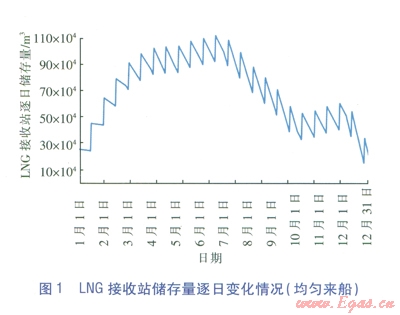 模、LNG接收站每月庫存變化情況及趨勢(shì)、上游LNG船次。調(diào)整船期,在保證下游季節(jié)調(diào)峰要求的前提下,降低LNG接收站的投資額。動(dòng)態(tài)分析的方法可用于設(shè)計(jì)前期確定LNG接收站儲(chǔ)存規(guī)模,確定經(jīng)濟(jì)合理的儲(chǔ)罐數(shù)量,初步掌握均勻來船和船期調(diào)整后LNG接收站庫存變化情況。