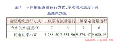不同輸配系統(tǒng)運行方式、冷水供水溫度下冷源耗電功率見表l。當(dāng)冷水供水溫度為