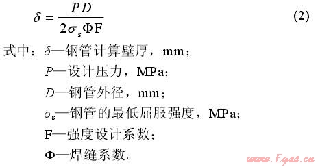 管道壁厚選取不僅要求滿足管道強度、穩(wěn)定性要求,同時應(yīng)滿足抗御外力破壞的要求。按照《城鎮(zhèn)燃氣設(shè)計規(guī)范》(GB50028—2006)的相關(guān)要求,直管段管壁厚度按公式(2)計算: