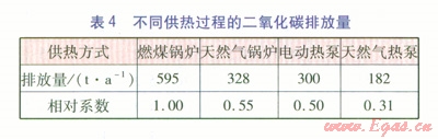 根據(jù)表3的數(shù)據(jù),由式(6)可以計(jì)算得到不同供熱過(guò)程韻二氧化碳排放量(見表4)。由表4可知,燃煤鍋爐的二氧化碳排放量最大,天然氣熱泵排放量最小,天然氣鍋爐與電動(dòng)熱泵的排放量居中。