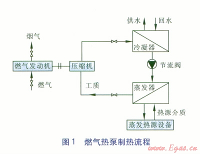燃煤鍋爐和燃天然氣鍋爐供熱均為直接燃燒供熱,燃煤鍋爐制熟效率取80%,天然氣鍋爐制熱效率取85%。熱泵供熱是利用逆卡諾循環(huán)的原理將低品位的熱能提升到供暖熱水的溫度而進(jìn)行制熱。燃?xì)鉄岜弥茻釙r(shí),壓縮機(jī)靠燃?xì)獍l(fā)動(dòng)機(jī)驅(qū)動(dòng),其流程見圖l。電動(dòng)熱泵制熱時(shí),壓縮機(jī)采用電動(dòng)機(jī)驅(qū)動(dòng)。