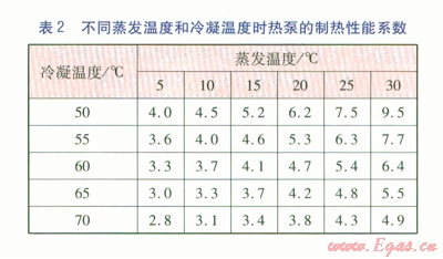 由式(3)可以計(jì)算得到不同蒸發(fā)溫度和冷凝溫度時(shí)的熱泵制熱性能系數(shù)(見表2)。