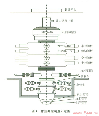 由于裸眼水平井氣層暴露面積大、產(chǎn)能高、作業(yè)井控風(fēng)險大,井控設(shè)備采用2FZ28-105EE級液壓(半封+全封)閘板+2FZ28-105EE級液壓(剪切+半封)閘板+FH28-70EE環(huán)形防噴器的組合配置(圖4)。裸眼井作業(yè)施工可能涉及不同規(guī)格的鉆桿或油管,因此,多增加了一個環(huán)形防噴器,能保證多種工況條件下發(fā)生溢流或井涌異常時,井口能得到及時有效的控制。