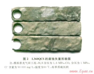 普光氣田優(yōu)選L360QCS抗硫管線鋼作為集輸系統(tǒng)管材,針對(duì)其集輸系統(tǒng)實(shí)際工況,開展了一系列腐蝕速率、SSC以及HIC試驗(yàn),并進(jìn)行緩蝕劑評(píng)價(jià)試驗(yàn)[4],試驗(yàn)條件:H2S分壓l.8 MPa,CO2分壓1MPa,模擬普光氣田地層水情況,其中Cl-含量為90 000 mg/L。照標(biāo)準(zhǔn)NACE TM0177-2005和ISO 3183-3及模擬工況下條件進(jìn)行試驗(yàn),評(píng)價(jià)結(jié)果表明:L360QCS抗硫管線鋼均表現(xiàn)出較好的耐SSC和HIC性能,但存在較為嚴(yán)重的電化學(xué)腐蝕,平均腐蝕速率為0.4mm/a,因此,需要采取抑制電化學(xué)腐蝕的措施。