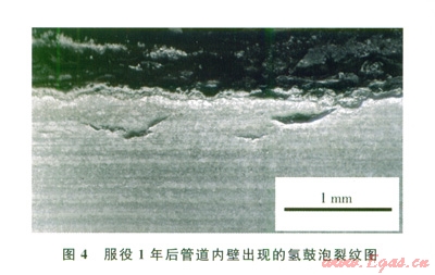 取樣結(jié)果顯示,管材內(nèi)表面無(wú)SSC裂紋,僅有少量氫鼓泡,管壁內(nèi)部無(wú)氫致開裂裂紋(圖4),也就是說(shuō)在高含硫工況下環(huán)境開裂問(wèn)題不嚴(yán)重,管材服役性能良好。