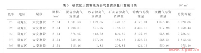 通過統(tǒng)計(jì)出的每口井含氣頁巖層段的厚度,可以繪制出含氣頁巖層段厚度等值線圖,同時(shí)結(jié)合地震資料追蹤有效層段,控制平面上等值線的走勢。根據(jù)研究區(qū)塊大安寨段巖石物性分析測試數(shù)據(jù),大安寨段頁巖密度平均為2.61 g/cm3。根據(jù)實(shí)例井大安寨段實(shí)測TOC資料及現(xiàn)有的測井資料進(jìn)行了多元統(tǒng)計(jì)分析擬合,計(jì)算出吸附氣量,繪制TOC等值線圖及吸附氣量等值線圖,計(jì)算出吸附氣資源量;根據(jù)實(shí)測孔隙度資料、現(xiàn)有的測井?dāng)?shù)據(jù)分別分析擬合、計(jì)算孔隙度,進(jìn)而計(jì)算含水(氣)飽和度和游離氣百分含量,最終得到游離氣資源量;最后計(jì)算m該研究區(qū)不同概率的總資源量(表3)。