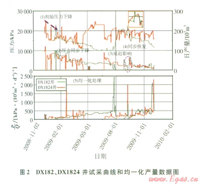 DX182、DX1824兩口井的試采曲線形態(tài)都有一個(gè)初始的壓力下降過程,隨著生產(chǎn)進(jìn)行一段時(shí)間之后,二者壓力表現(xiàn)為同步下降。但是,當(dāng)DX182井關(guān)井之后,DX1824井的套壓由逐步下降的趨勢(shì)變?yōu)槠骄彛f明DX182井的關(guān)井對(duì)DX1824井有一個(gè)延遲影響。2 009年9月,在兩口井同時(shí)關(guān)井之后,這兩口井的壓力恢復(fù)到一個(gè)比較接近的值。最后,對(duì)這兩口井壓力、產(chǎn)量進(jìn)行均一化處理,曲線的趨勢(shì)也大體接近[7-8](圖2)。因此,試采曲線表明,DXl82、DXl824兩口井連通。