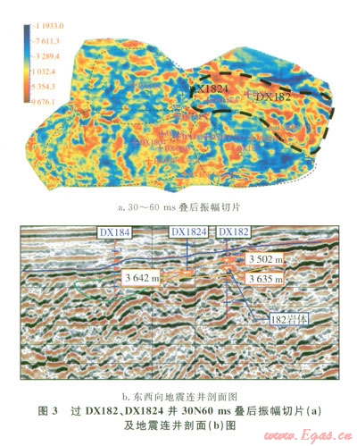 通過地震屬性分析、地震剖面刻畫進(jìn)行火山巖體輪廓追蹤識(shí)別及內(nèi)幕結(jié)構(gòu)精細(xì)解釋[10],可以清楚地看到DX182、DX1824井試采井段同屬“182”次火山巖體(圖3),其火山巖儲(chǔ)層的連續(xù)性好,這也從地質(zhì)上證明了DX182、DX1824兩口井連通。