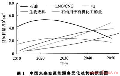圖1是中國未來交通能源多元化趨勢的預測圖[1]。