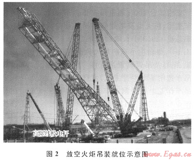 2009年6月16日和6月19日,采用整體滑移法分別完成了第1、2座放空火炬的吊裝,每座放空火炬的吊裝僅用了約50min,安全、順利、快捷,而且吊耳梁沒有任何變形。放空火炬吊裝就位示意圖如圖2所示。若采用分段吊裝、空中組對方案,不僅需要搭設高空組裝平臺,安全風險大,進度慢,而且要進行2次400t履帶吊車塔式工況組裝和1次塔式工況拆除,至少需要11d時間,分段吊裝每座放空火炬又至少需要2d時間,此外,因占用400t吊車時間長,還會影響其他大型設備吊裝作業(yè),延緩工程施工工期。因此,采用分解吊點受力法整體吊裝放空火炬,不僅提前13d完成放空火炬吊裝任務,節(jié)省400t履帶吊車租用費36萬元,加快了整個工程大型設備吊裝進度,特別是在施工現(xiàn)場緊缺吊耳梁材料的情況下,采用分解吊點受力的方法,成功解決了吊耳梁強度不足的難題,實現(xiàn)了吊耳梁以小代大的嘗試,圓滿完成了大型放空火炬吊裝任務,在吊裝技術上是一種創(chuàng)新。