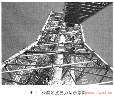 根據(jù)放空火炬塔架的結(jié)構(gòu)特點,整體吊裝放空火炬的吊點最適合設置在距塔架底部42m的塔架橫梁處,該處的塔架主肢為乃450mm×12mm鋼管,橫梁為Φ159mm×6mm無縫鋼管。為了在吊耳梁上安裝能滿足吊裝要求的吊耳,需將Φ159mm×6mm橫梁更換為DN400mm或DN350mm的厚壁鋼管,但現(xiàn)場只有Φ356mm×16mm(20號鋼)的無縫鋼管,且土庫曼斯坦資源匱乏,無法采購到合適的吊耳梁材料,從國內(nèi)采購、運輸?shù)闹芷谟趾荛L,無法滿足工期要求。經(jīng)計算,若采用Φ356mm×16mm的無縫鋼管制作吊耳梁,其與吊耳相貫處的彎曲應力達到586MPa,是其許用應力(137MPa)的4倍多,達不到吊裝要求。在此情況下,經(jīng)過技術論證和可行性研究,決定使用Φ356mm×16mm的無縫鋼管制作吊耳梁,并采用分解吊點受力的方法,以降低吊耳梁的彎矩和應力。具體方法是用鋼絲繩把吊耳和吊點下部34m標高的塔架主肢節(jié)點連接起來,并對鋼絲繩施加3t預拉力,將超過吊耳梁承受能力的吊裝負荷通過鋼絲繩傳遞到34m標高的塔架主肢節(jié)點上,鋼絲繩的大小通過超載負荷計算得出。分解吊點受力法示意圖如圖1所示。
