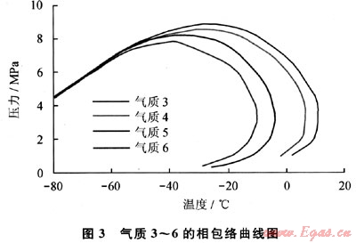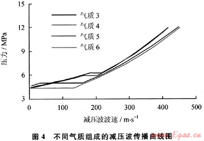 圖3為氣質(zhì)3~6的相包絡(luò)曲線圖,由表2和圖3可知,從氣質(zhì)3到氣質(zhì)6,氣質(zhì)組成逐漸變“輕”,其相包絡(luò)曲線的氣液兩相區(qū)域逐漸變小。圖4為不同氣質(zhì)組成的減壓波傳播曲線,初始壓力為12MPa,溫度為30℃。由圖4可知,各曲線出現(xiàn)“平臺”的壓力逐漸降低,“平臺”位置下降。由此可以推測,若氣質(zhì)組成中重組分含量減少至某程度時,減壓波曲線中的平臺將消失,變?yōu)橐粭l光滑的曲線。也就是說,隨著重組分含量的增加,減壓波曲線容易進入兩相區(qū),壓力保持在高位不能迅速下降,增大了管道裂紋擴展的風險。
