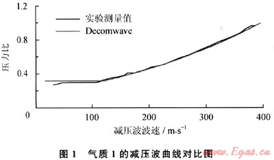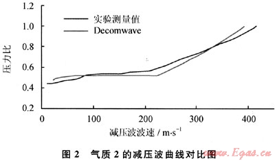 圖1為氣質(zhì)1減壓波波速計算結(jié)果與文獻實驗數(shù)據(jù)的對比圖,初始壓力為10.58MPa,溫度為-25.59℃。圖中“實驗測量值”指本文參考文獻[6]中通過實驗測得的數(shù)據(jù),“Decomwave”為開發(fā)軟件計算的減壓波波速結(jié)果。