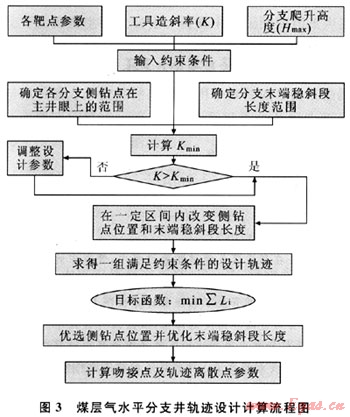 煤層氣水平分支井主水平井眼軌跡采用常規(guī)方法來進(jìn)行設(shè)計(jì),而分支井眼設(shè)計(jì)是多約束條件下的三維軌跡設(shè)計(jì)問題。在靶點(diǎn)參數(shù)、工具造斜率和分支爬升高度約束下,以分支長度最短為優(yōu)化目標(biāo),優(yōu)選各分支側(cè)鉆點(diǎn)和末端穩(wěn)斜段長度,然后計(jì)算吻接點(diǎn)參數(shù),其計(jì)算流程如圖3所示。