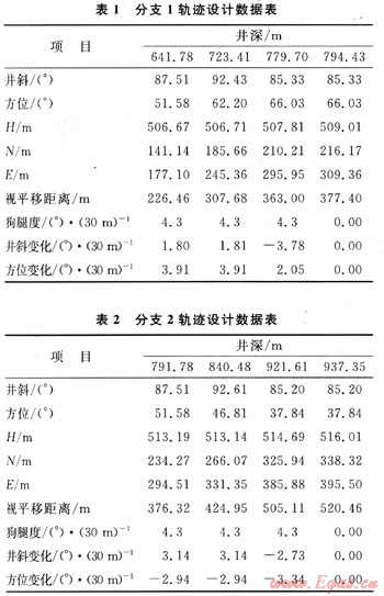 本文參考文獻(xiàn)[1]給出了Ai、Bi、Ci的計(jì)算方法,由式(7)、(8)求得煤層氣水平分支井三維軌跡設(shè)計(jì)的約束方程為:Lm1=Lm2,其有解的判別式為△=Bi2-4AiCi≥0(i=1,2)。因此,可精確求出造斜率K0,通過改變L1和L2可使K0逼近于工具造斜率K,從而設(shè)計(jì)出滿足約束條件的三維設(shè)計(jì)軌跡。