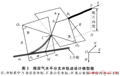 煤層氣水平分支井技術(shù)通過將主井眼和分支井眼部署在同一產(chǎn)層,在水平段主體井眼兩側(cè)側(cè)鉆分支來增加煤層的橫向動(dòng)用程度,以此提高煤層氣井的開發(fā)效率。在國外,已開發(fā)出專門用于煤層氣水平分支井的軌跡設(shè)計(jì)軟件,并取得了很好的應(yīng)用效果;而國內(nèi)對(duì)煤層氣水平分支井的研究雖已取得了一定進(jìn)展,但仍有待于發(fā)展和完善。截至目前,國內(nèi)有關(guān)分支爬高高度和工具造斜率約束下煤層氣水平分支井軌跡設(shè)計(jì)的文獻(xiàn)尚未見報(bào)道,加之國外對(duì)其設(shè)計(jì)方法和模型算法尚未公開,限制了煤層氣水平分支井技術(shù)在我國的進(jìn)一步推廣和應(yīng)用。