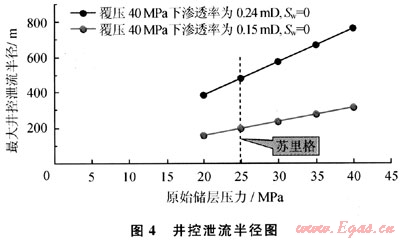 對(duì)于蘇里格氣田而言,其原始地層壓力在25MPa左右,則覆壓40MPa下滲透率為0.12~0.312mD(平均值0.24mD)的不含水儲(chǔ)層最大井控半徑約為474m,覆壓40MPa下滲透率為0.015mD的不含水儲(chǔ)層最大井控半徑約為193m。