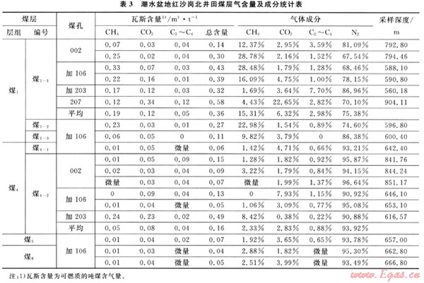 根據(jù)紅沙崗煤礦煤孔瓦斯測(cè)定,煤層甲烷(瓦斯)含量非常低,均以氮?dú)鉃橹?表3[5]);上部煤1層(組)瓦斯含量比煤4、煤5和煤6層(組)高,尤其是煤1-1層甲烷含量是其他煤層的幾倍到幾十倍,可能是煤1-1層直接頂板油頁(yè)巖起到的封閉作用最好。