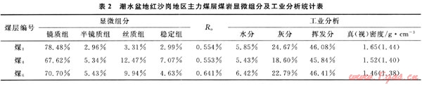 紅沙崗地區(qū)煤層以光亮、半亮型煤為主,鏡煤、亮煤、暗煤?;映霈F(xiàn)[5];煤巖顯微組分以鏡質(zhì)組為主(表2),一般超過80%,惰性組很少,殼質(zhì)組含量較高,為3%~8%,對(duì)煤層氣的生成有利。