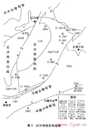 紅沙崗呈北東翹起向南西傾伏的寬緩復(fù)式向斜構(gòu)造[4],軸向北東東(約73°),軸長(zhǎng)大于5km;西北翼平緩,傾角10°~20°;東南翼較陡,傾角一般超過25°,北部最陡處可超過55°,次級(jí)褶皺、斷裂發(fā)育。