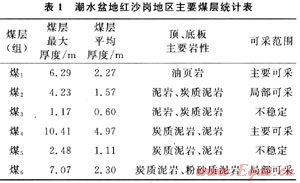 紅沙崗地區(qū)共含6個(gè)煤層(組)[5~6],總厚度介于3~35m(圖3),煤層自上而下依次編號(hào)為煤1~煤6層(組)(表1)。其中煤1和煤4層(組)層位穩(wěn)定,且分布面積廣,為主要可采煤層,也是煤層氣主要勘探目的層;煤2、煤6層(組)為局部可采煤層;煤3、煤5層(組)極不穩(wěn)定。煤1、煤2、煤3層(組)位于中巖組下部,煤4、煤5、煤6層(組)位于下巖組上部[7]。