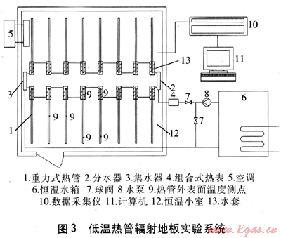 碳鋼/水重力式熱管(又稱碳鋼/水兩相閉式熱虹吸管)具有結(jié)構(gòu)簡(jiǎn)單、成本低廉、傳熱性能優(yōu)良、工作可靠等特點(diǎn),在冶金、化工、建材、動(dòng)力等行業(yè)有很多成功的應(yīng)用實(shí)例[1]。隨著熱管技術(shù)的不斷成熟,其在建筑行業(yè)的應(yīng)用引起了學(xué)者們的關(guān)注。JEBRAIL等制作了熱管散熱器并測(cè)試了其熱工性能[2],國(guó)內(nèi)學(xué)者蔣愛華等對(duì)熱管輻射墻壁進(jìn)行了探討[3],羅清海等分析了不同工質(zhì)熱管散熱器的熱工性能[4]。本文擬將碳鋼/水重力式熱管與地板輻射采暖系統(tǒng)結(jié)合起來,以期利用其優(yōu)良的傳熱性能,在提供舒適熱環(huán)境的同時(shí),達(dá)到降低供水溫度、減小熱水循環(huán)流量、提高系統(tǒng)整體運(yùn)行效率和經(jīng)濟(jì)性的目的。本文在重力式熱管和串聯(lián)熱管傳熱性能研究的基礎(chǔ)上[5],對(duì)低溫?zé)峁茌椛涞匕宓臒峁ば阅苓M(jìn)行實(shí)驗(yàn)研究。