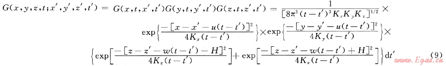 根據(jù)動態(tài)泄漏率不定常的特點,以氣體動力學理論和湍流擴散微分方程為基礎,結(jié)合相應的初始條件和邊界條件,利用格林函數(shù)進行推導,可得綜合擴散模型格林函數(shù)為: