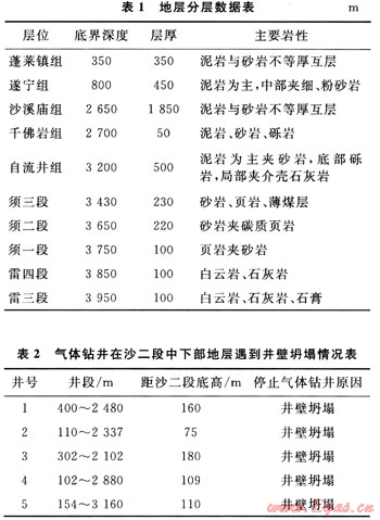 九龍山構(gòu)造區(qū)域?qū)儆诖ū臂晗輲е袎?、九龍山北東向構(gòu)造群,米倉山山前帶南部。西北緊鄰龍門山推覆構(gòu)造帶,北部為米倉山臺(tái)緣隆起,東南與川中隆起帶相鄰。地層分層數(shù)據(jù)見表1。地層分層的數(shù)據(jù)表明,在于佛巖組與自流井組存在堅(jiān)硬的礫巖層,其礫巖成分有石英、燧石和黃鐵礦等,研磨性強(qiáng),可鉆性極差,將導(dǎo)致機(jī)械鉆速急劇降低,以龍17井為例,在千佛巖組2932~3036m井段,進(jìn)尺共104m,消耗鉆頭11只,平均單只鉆頭進(jìn)尺僅為9.5m,平均機(jī)械鉆速為0.85m/h。多個(gè)區(qū)塊的鉆井實(shí)踐表明[3~6],與其他鉆井技術(shù)相比,氣體鉆井的提速效果異常明顯。因此,九龍山構(gòu)造開發(fā)前期,在沙溪廟組廣泛開展氣體鉆井技術(shù),但是氣體鉆井雖然機(jī)械鉆速加快,但多口井卻出現(xiàn)井壁坍塌,使井況更加復(fù)雜(表2),且由氣體鉆井轉(zhuǎn)換為常規(guī)鉆井后,下部地層的機(jī)械鉆速降低明顯。若要在下部地層繼續(xù)安全快速鉆進(jìn),液體欠平衡鉆井可作為一種重要手段。