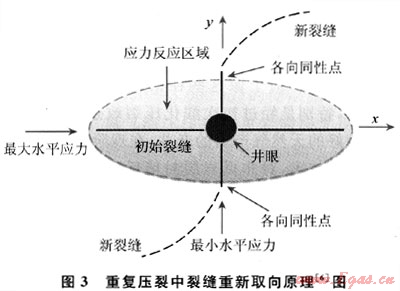 重復(fù)壓裂是指當(dāng)頁(yè)巖氣井初始?jí)毫烟幚硪呀?jīng)無(wú)效或現(xiàn)有的支撐劑因時(shí)間關(guān)系損壞或質(zhì)量下降,導(dǎo)致氣體產(chǎn)量大幅下降時(shí),采用壓裂工藝對(duì)氣井經(jīng)行重新壓裂增產(chǎn)的工藝。頁(yè)巖氣井初始?jí)毫押螅?jīng)過(guò)一段時(shí)間的生產(chǎn),井眼周?chē)膽?yīng)力會(huì)發(fā)生變化,重復(fù)壓裂能夠重新壓裂裂縫或使裂縫重新取向,使頁(yè)巖氣井產(chǎn)能恢復(fù)到初始狀態(tài)甚至更高(圖3)。美國(guó)Barnett頁(yè)巖在1995年前廣泛使用凝膠壓裂,1997年開(kāi)始發(fā)展清水壓裂,作業(yè)者對(duì)先前使用凍膠壓裂增產(chǎn)產(chǎn)量下降的井使用清水壓裂重新改造,改進(jìn)處理液回收工作流程,氣井產(chǎn)量明顯提高,部分井產(chǎn)量甚至超過(guò)了初次壓裂時(shí)的產(chǎn)量[5]。