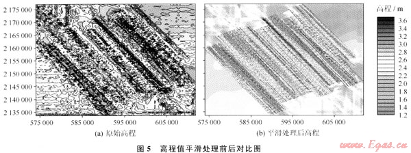 在室內(nèi)處理中使用SkyFix XP定位系統(tǒng)測量地震采集過程中地震船實時的大地高程,然后通過高程轉(zhuǎn)換,計算出地震采集過程中實時的潮汐值。利用SkyFix XP高程進行潮汐校正,需要進行高程值平滑處理,消除各種偶然誤差帶來的對高程的跳變影響。從圖5中可以看出各航行線之間高程的明顯變化,同時也反映了由于潮汐變化使地震采集不是在一個固定平面上進行的事實。
