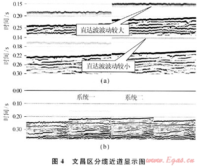 除了海底的問題外,近遠纜的空間分布的位置及地下介質(zhì)的吸收系數(shù)、反射系數(shù)不同,會使得不同電纜接受的反射信號存在著差異。所以認為,近遠纜接受信號的差異是海上地震資料采集腳印嚴重的重要原因之一。在文昌區(qū)某些早期采集的地震數(shù)據(jù)中,不同線之間的采集質(zhì)量差異較大(圖4-b)。從直達波可以看出圖4-a上中直達波波動較大,說明采集時所受外界影響大,質(zhì)量較差;而圖4-a下中直達波波動較小,說明采集時所受外界影響小,質(zhì)量較好。特別在文昌區(qū)中地震數(shù)據(jù)采集時有兩個記錄系統(tǒng),兩個系統(tǒng)之間的不穩(wěn)定帶來采集腳印的影響非常嚴重,系統(tǒng)二采集質(zhì)量較好,系統(tǒng)一遠纜采集質(zhì)量較差。以上原因也是導致該工區(qū)的采集腳印非常嚴重的另一個原因。