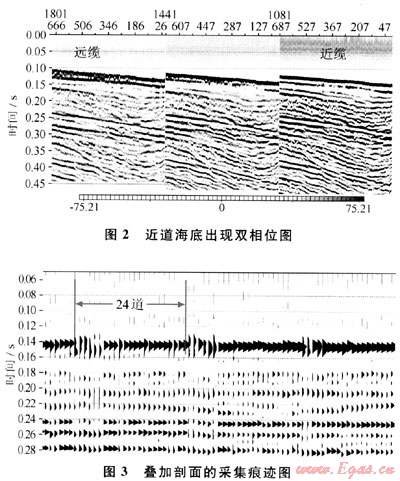 在海上三維采集中,由于海上拖纜特殊的采集方式,觀測系統(tǒng)因素除了陸上采集的觀測系統(tǒng)因素(激發(fā)和接收線距、寬方位和窄方位、覆蓋次數(shù)、方位角、炮檢距和源致線性干擾)外,還有因震源、電纜檢波點位置都處于相對運動狀態(tài)而帶來的其獨特影響。非觀測系統(tǒng)因素則包括了潮汐、水溫、含鹽度、水流方向、洋流、風力、采集工區(qū)的水深、氣槍容量、氣槍壓力的變化、工區(qū)的地質(zhì)條件以及出于經(jīng)濟方面的考慮海上拖纜采集以轉(zhuǎn)圈的采集方式等多方面的影響。在對文昌區(qū)數(shù)據(jù)進行檢查與分析時,通過逐纜抽取地震數(shù)據(jù)近道檢查可以看到,通常遠纜采集質(zhì)量較差,而且接收到的能量與近纜是有差異的。局部區(qū)域在遠纜近道顯示上的海底甚至出現(xiàn)雙相位(圖2),造成疊加數(shù)據(jù)體每隔24道(與處理面元有關(guān))海底成像不好出現(xiàn)嚴重的采集痕跡(圖3)。經(jīng)分析,這種現(xiàn)象受水深及采集時的最小偏移距的共同影響,在水深100m左右的工區(qū)中這種遠纜出現(xiàn)雙相位的現(xiàn)象特別明顯,而水深超過120m后遠纜出現(xiàn)雙相位的情況就沒有那么明顯了,在水深小于50m時,地震數(shù)據(jù)體的海底基本上不成像。