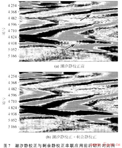 地震資料處理中,利用SkyFix XP進行潮汐校正后,在一定程度上提高了地震資料的分辨率,地震資料有了明顯的改善,減輕了采集腳印,消除了在CDP方向可能出現(xiàn)的“垂直斷層”現(xiàn)象。