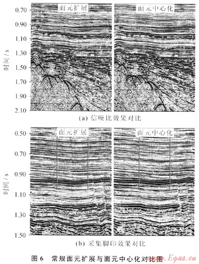 從圖6-a上看采用面元中心化后疊加信噪比有明顯的提高。圖6-b中顯示面元中心化與面元擴展對比,采集腳印得到了一定衰減。