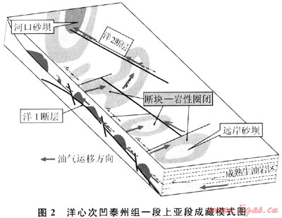 油氣成藏研究表明,白駒凹陷洋心次凹洋1、洋2、洋3等北西-南東向的斷層是在泰州組,阜寧組沉積完以后發(fā)育,三垛運動定型,其對泰一段上亞段的砂體沉積不起控制作用。但洋1斷層貫穿緩坡帶上的多個小砂壩,并與成熟生油區(qū)相連接,它將成熟生油區(qū)生成的石油,通過與其形成輸導(dǎo)網(wǎng)絡(luò)的次級斷層和砂體運移到各個有利圈閉中,形成油藏,是開陽等油藏的主要油源的運移通道?,F(xiàn)有的白駒油區(qū)已發(fā)現(xiàn)的油藏均屬此類。