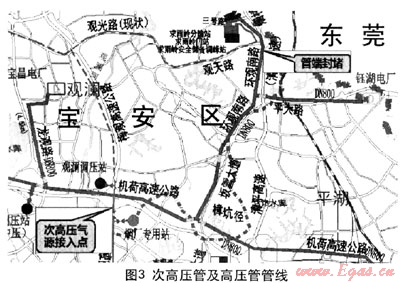 該方案將西氣東輸二線到來后將使用的天然氣高壓管線與目前的次高壓天然氣管線結(jié)合,利用該段已建好的高壓管線與次高壓管線連接,通過次高壓管網(wǎng)供應電廠。管線情況見圖3。
