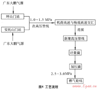 該方案只需煙廠專用調(diào)壓站后的次高壓管線與機荷高速、坂雪大道、環(huán)觀南路、平大路的高壓管線聯(lián)通,目前只需建設6.42km,即可聯(lián)通,從工期上來說,應可以滿足需求。電廠內(nèi)需建設計量撬、加壓撬,工藝流程見圖4。