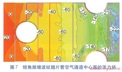 空氣進(jìn)口速度為4m/s時(shí),兩種波紋翅片管空氣通道中心面的壓力(表壓)場(chǎng)分別見圖6、7,圖中數(shù)值單位為Pa。由圖6、7可知,兩種波紋翅片管的壓力分布均比較紊亂。傾角漸增波紋翅片管空氣通道中心面的壓力降要大于均勻傾角波紋翅片管,且隨著翅片傾角的增大,等壓線分布更加稠密。原因是傾角漸增波紋翅片結(jié)構(gòu)對(duì)流體的阻滯和擾動(dòng)作用都較大,阻力比均勻傾角波紋翅片管大。