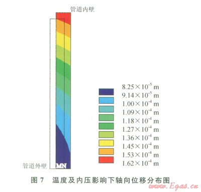 由分析可知,在內(nèi)壓和溫度影響下,最大應(yīng)力在管道內(nèi)壁產(chǎn)生,約50 MPa。由此可知,溫度作用中內(nèi)壓的變化會(huì)影響管道應(yīng)力大小及分布。由于管道只有一端有固定墩約束,管道司以沿軸向嚴(yán)生伸長(zhǎng)變形,應(yīng)力通過(guò)軸向伸長(zhǎng)得以補(bǔ)償而減小,軸向最大位移為0.Ol62mm。