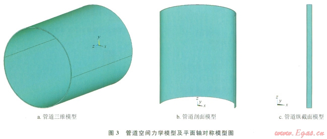 根據(jù)彈性力學(xué)和有限元理論,管道熱應(yīng)力和外擠載荷的空間問(wèn)題可以應(yīng)用平面應(yīng)力及軸對(duì)稱建立平面有限元模型,計(jì)算分析管道的應(yīng)力分布及大小如圖3所不。圖3-a為1219mm外徑X80管道空間力學(xué)模型;圖3-b為X80管道三維剖面,以2軸為對(duì)稱軸;圖3-c為管道縱軸旋轉(zhuǎn)截面,以z軸為對(duì)稱軸旋轉(zhuǎn)。