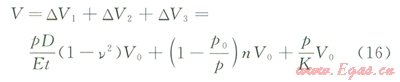 實(shí)踐中,對(duì)于式(10),由于徑向?yàn)楣艿辣诤穹较?,?duì)于大口徑薄壁管,擘厚變化引起的管道體積變化較小,以規(guī)格為l219×22mm規(guī)格的管道為例,經(jīng)測(cè)算,僅為DVl的5%,若考慮空氣、水的壓縮性,該比例還將大大降低。因此,本文將該壁厚變化引起的體積變化忽略,得到DVl表達(dá)式為: