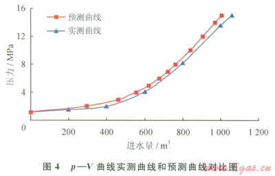同時(shí),分析預(yù)測(cè)曲線中V的組成,其中DV1、DV2、DV3各自所占的比例見(jiàn)表l,由水壓縮性計(jì)算而得的DV3,其值超過(guò)DV1,是試壓進(jìn)水量的一個(gè)重要因素,不可在計(jì)算中忽略。