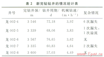 2010年下半年新鉆的以珍珠沖組和須家河組為目的層的中深井,包括龍002-4、龍002-5、龍002-6、龍002-7、龍002-8井等井,實(shí)鉆基本采納了建議的鉆井井身結(jié)構(gòu)和鉆井液密度安全窗口,中間技術(shù)套管下至坍塌壓力逐步抬升之前的沙溪廟組中下部,下部作為單獨(dú)一開井眼;另外除龍002-6井外,各井鉆井方向選擇有利本區(qū)井壁穩(wěn)定性的方向(即75°~l65°或255°~345°);結(jié)合利用新技術(shù)(空氣鉆井、欠平衡鉆井、優(yōu)選鉆頭)鉆井效率得到明顯提高,基本沒有出現(xiàn)阻卡現(xiàn)象,僅偶爾出現(xiàn)幾次漏失或溢流情況,鉆井事故、復(fù)雜大大降低,如表2所示。其中龍002-4井刷新九龍山第四次開鉆的疹152.4mm井眼定向井最短鉆井周期(原紀(jì)錄為l02d)和最高機(jī)械鉆速(原紀(jì)錄為2.79m/h)兩項(xiàng)紀(jì)錄;龍002-8井完鉆周期只有57.03d,刷新了九龍山四開以須二段為目的層的直井最短周期記錄。地應(yīng)力分析技術(shù)(GMI)在九龍山新鉆井中取得很好的應(yīng)用效果。