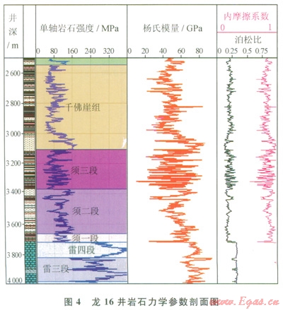 GMI地應(yīng)力模型提供了三軸主地應(yīng)力(上覆地層壓力、最小水平主應(yīng)力、最大水平主應(yīng)力)的大小和方向、地層孔隙壓力、巖石機(jī)械力學(xué)性質(zhì)(單軸巖石強(qiáng)度、楊氏模量、內(nèi)摩擦系數(shù)、泊松比)等4項(xiàng)參數(shù)的計(jì)算和描述。特殊地區(qū)還需考慮薄弱地層(特殊地層如鹽層)、原生斷層、裂縫的分布、地?zé)嵋蛩赜绊懙?。我們根?jù)九龍山構(gòu)造的鉆井、地質(zhì)、測井(包括成像測井)、測試等資料,以龍l6井為例建立了九龍山構(gòu)造的地應(yīng)力模型,基本摸清了本區(qū)的現(xiàn)今地應(yīng)力狀態(tài)。