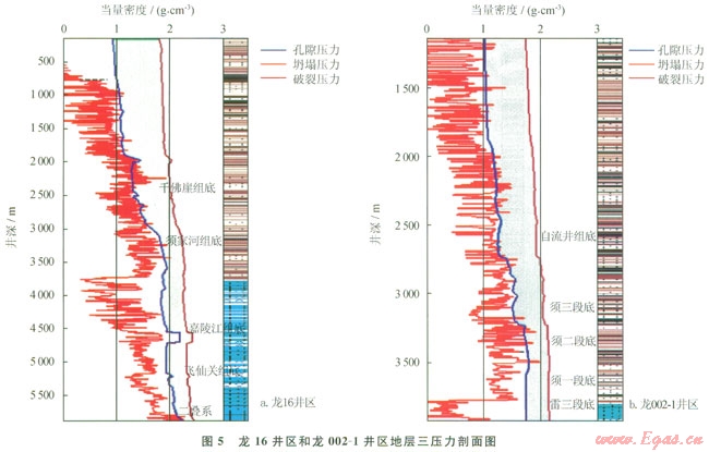 把九龍山構(gòu)造地應(yīng)力狀態(tài)和巖石力學(xué)參數(shù)有機(jī)結(jié)合起來,計(jì)算獲得九龍山構(gòu)造的龍16井區(qū)和龍002-l井區(qū)地層三壓力剖面(圖5)。