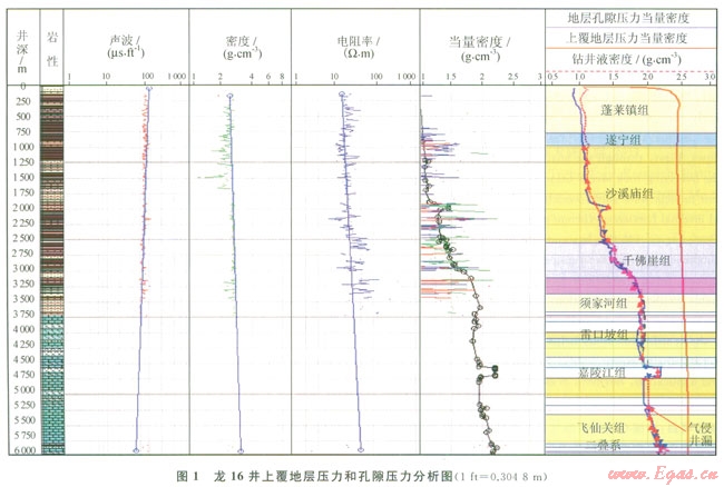 龍16井陸相地層的聲波、密度和電阻率3條曲線從中侏羅統(tǒng)沙溪廟組下部開始出現(xiàn)明顯偏離泥巖正常壓實(shí)趨勢[5](圖1)。因此判斷地層孔隙壓力白沙溪廟下部逐漸升高,部分井上三疊統(tǒng)須家河組的地層壓力系數(shù)高達(dá)l.83,本區(qū)實(shí)測壓力數(shù)據(jù)、鉆井液氣侵等現(xiàn)象也說明了須家河組具有較高的壓力異常。海相地層孔隙壓力形成機(jī)理和預(yù)測方法比較復(fù)雜,通過各井鉆井液密度、漏失和氣浸溢流等現(xiàn)象分析,認(rèn)為部分井段碳酸鹽地層壓力系數(shù)最高至2.15(如下三疊統(tǒng)嘉陵江組嘉二段高壓鹽水層)。